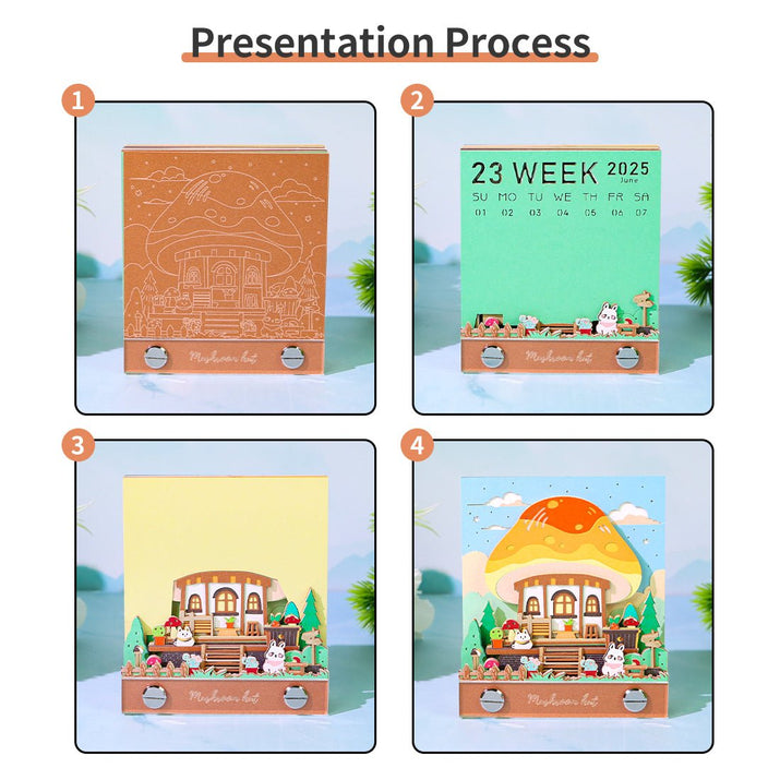 Answer 1: This calendar is not just a time-tracking tool; it transforms into a beautiful 3D model throughout the year, enhancing your workspace with artistic flair. Each month, you reveal a new component of a whimsical treehouse scene, combining creativity with functionality.